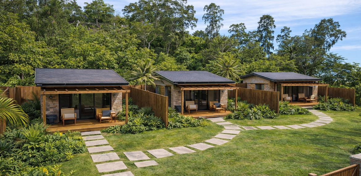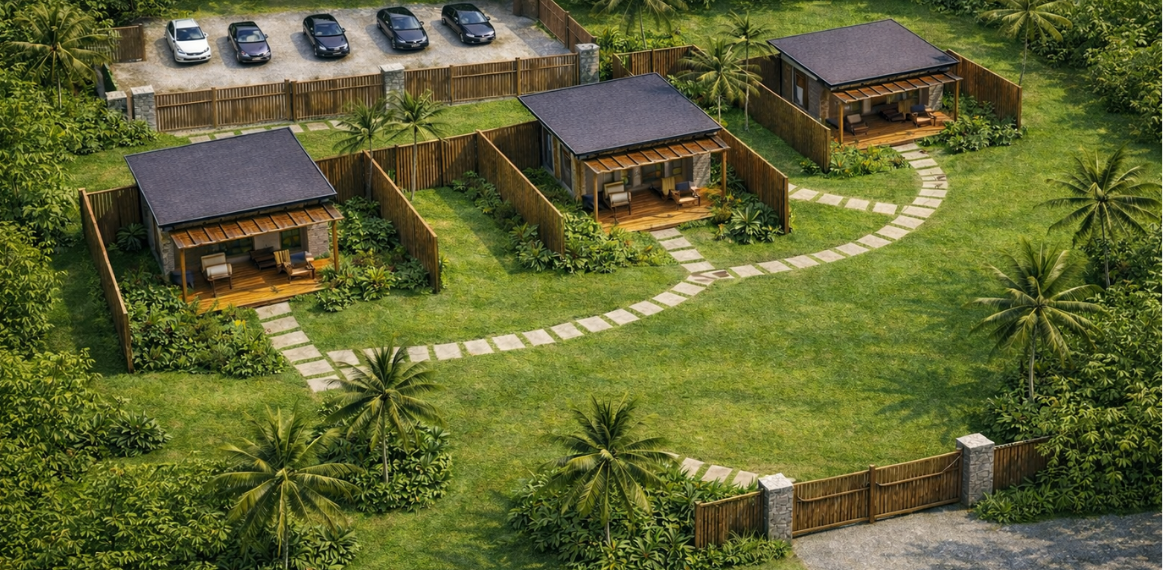 Each cottage is designed with simplicity and warmth in mind, incorporating pitched roofs, natural materials, and shaded verandas that enhance both aesthetics and functionality. The verandas extend the living spaces outdoors, creating a smooth transition between indoor comfort and open-air relaxation, making the development ideal for modern, nature-connected living.